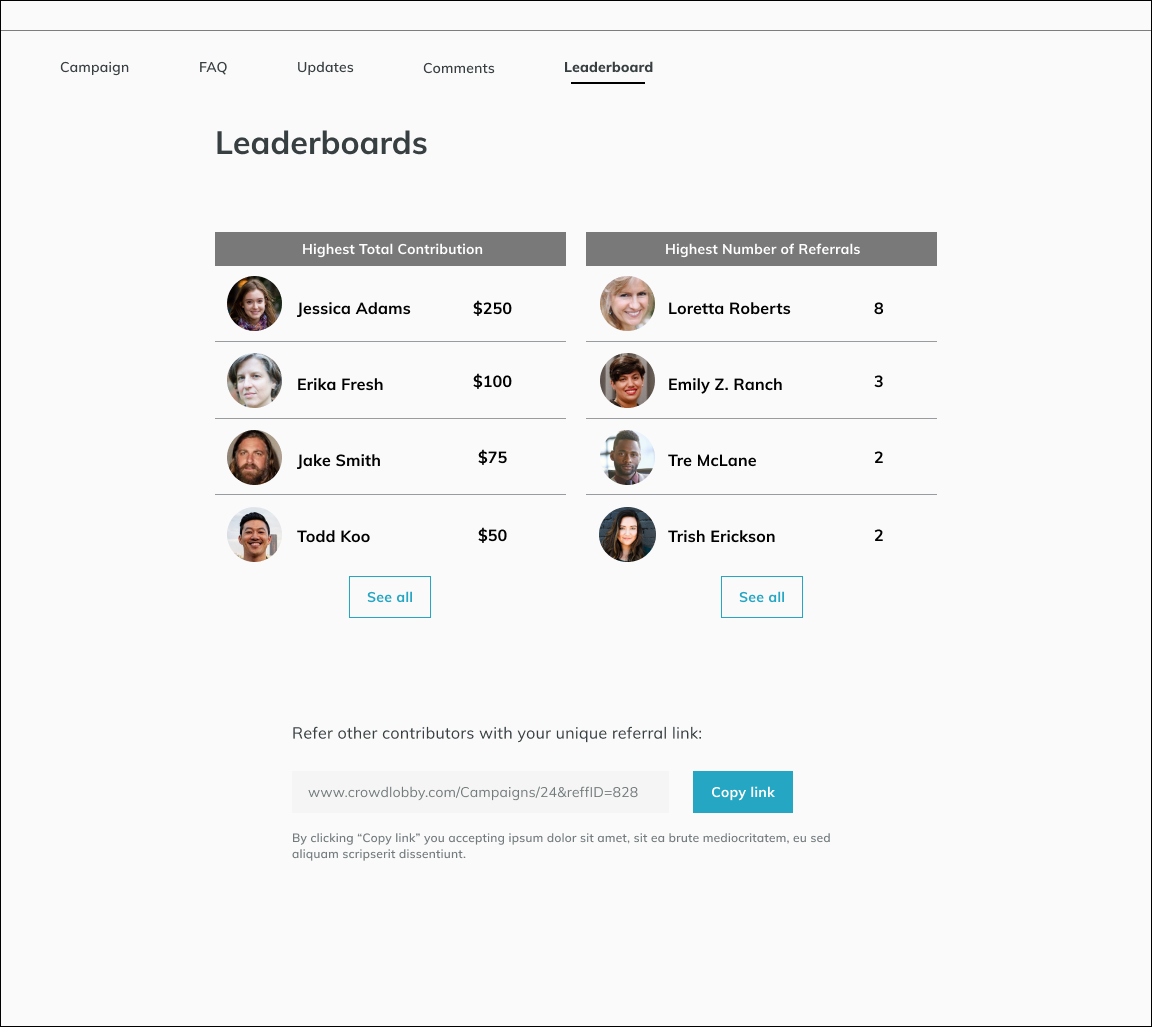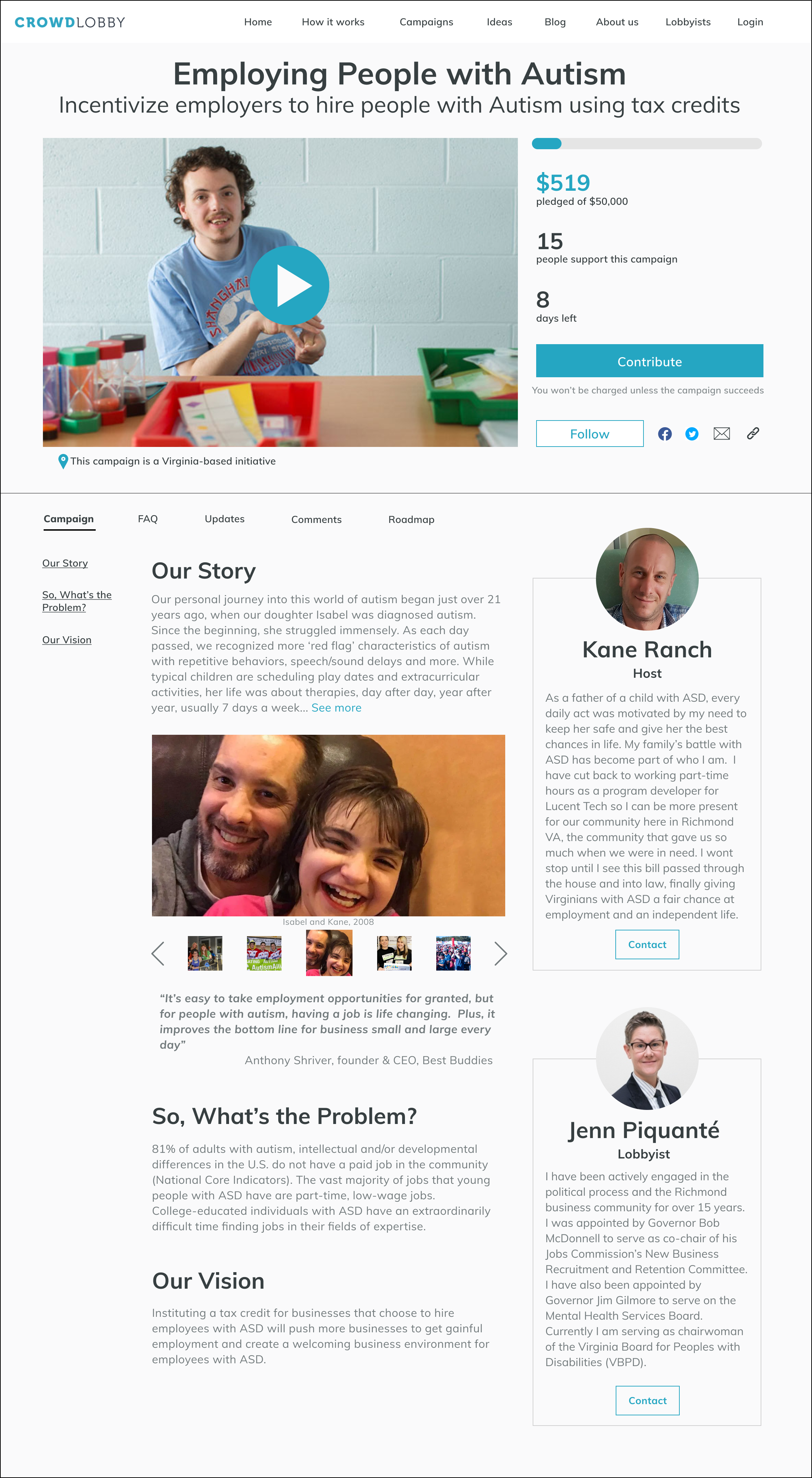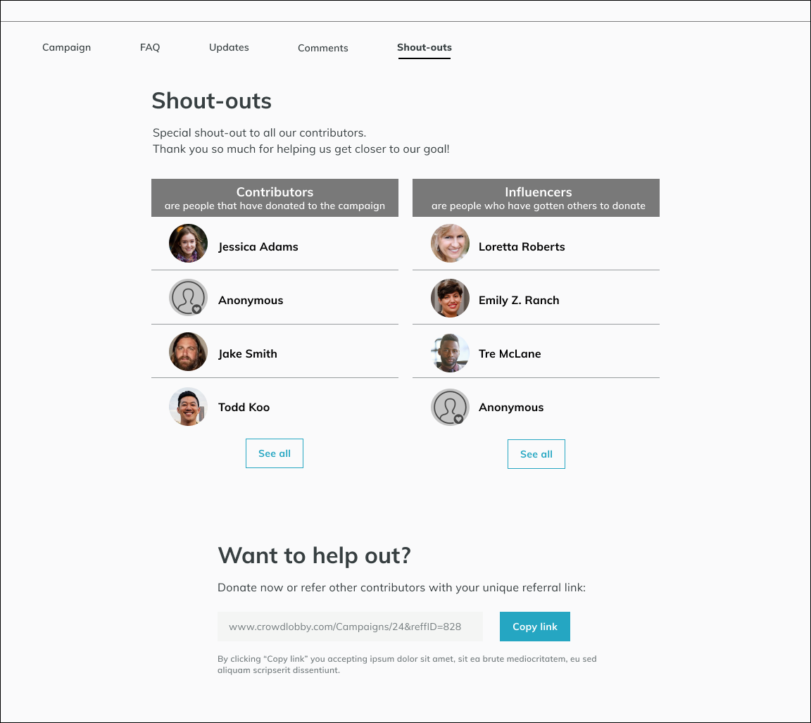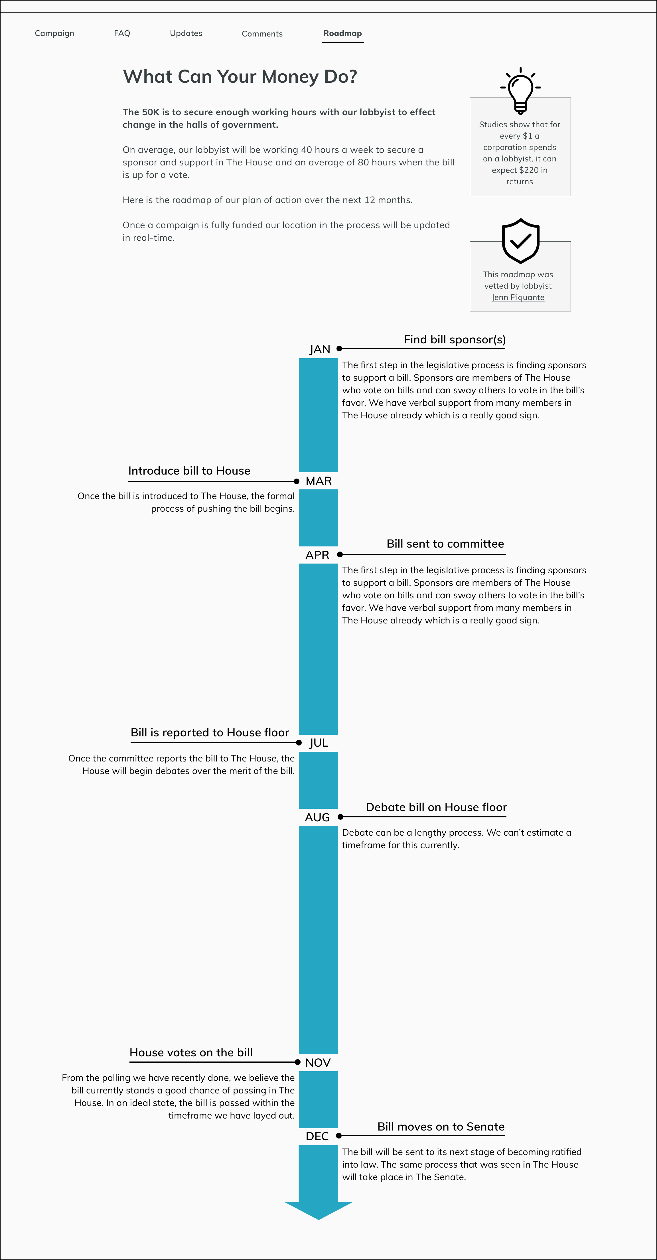 Our final design implemented a distinct hierarchy, a modern aesthetic and additional content, allowing potential donors easier access to information that was not previously provided. The design now offers the transparency that donors need and allows them to become emotionally connected to the campaign through prominent and personalized media, community engagement through an FAQ section, updates, a comments section, a financial spending plan called “Roadmap” and crucially, strategic messaging. We have included a pared-down version of our social proofing inspired design called “shouts-outs”, only showing who has donated and listed by the most recent contributors at the top. There is also the ability to donate anonymously. Each campaign on the Crowdlobby platform will now be run by an individual host instead of the stakeholders at Crowdlobby. This way the campaign messaging and media can easily be personalized and representative of those behind the campaign.