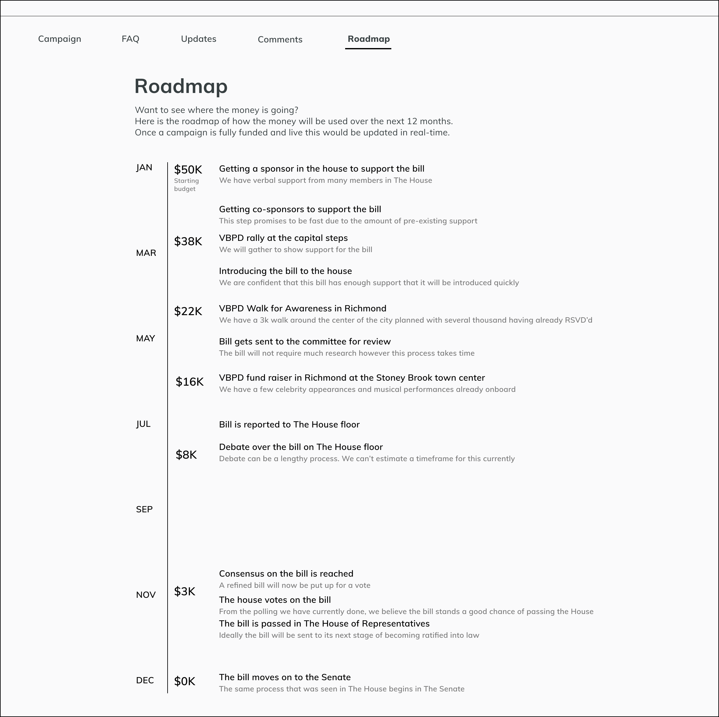 Users stated a much higher level of transparency connected to the new design when compared against the original design. The addition of months, dollar amounts, and a rough timeline were the key elements that created this new perception. Additionally, the user experienced an increase in their sense of confidence in the campaign and in the credibility of the site.